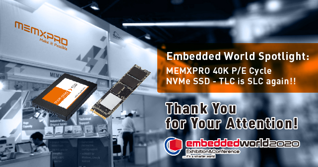 | MEMXPRO introduces its new generation of TLC SSDs with extra-long lifespan at the Embedded World 2019 show in Germany. On display were the new PT31 series TLC SSDs with SATA 3 interface and 10K P/E cycles, and the PC32 NVMe SSD PCIe Gen3 x4 interface series with 40K P/E cycles…. Read More |